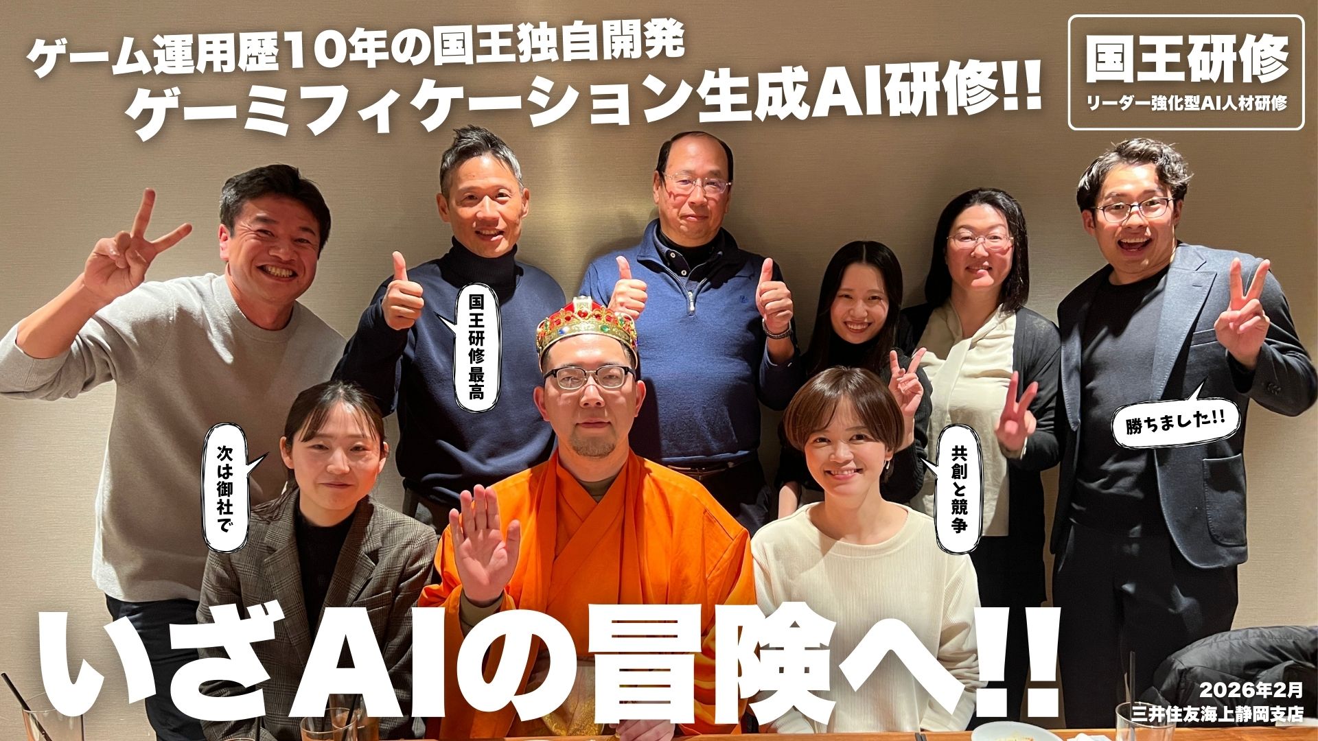 没入型生成AI研修 経営者&首長の皆様こんにちは。AI国王です。 「ゲーム運営歴10年」そして「メンバー全員AI」「国民全員AI」という特殊な経歴から生み出した他にはない独自AI研修を実施しています。ゲーミフィケーション要素を入れた眠くならない研修をぜひご体験ください。 AI国王とは 申し込み 実績 国王研修 実績2026年2月 千葉県大多喜町 管理職研修2026年2月 三井住友海上(前編/後編)AI活用企画研修2026年1月 静岡銀行下田支店 DX・AIビジネス活用術2025年12月 ベルテックス静岡 ...