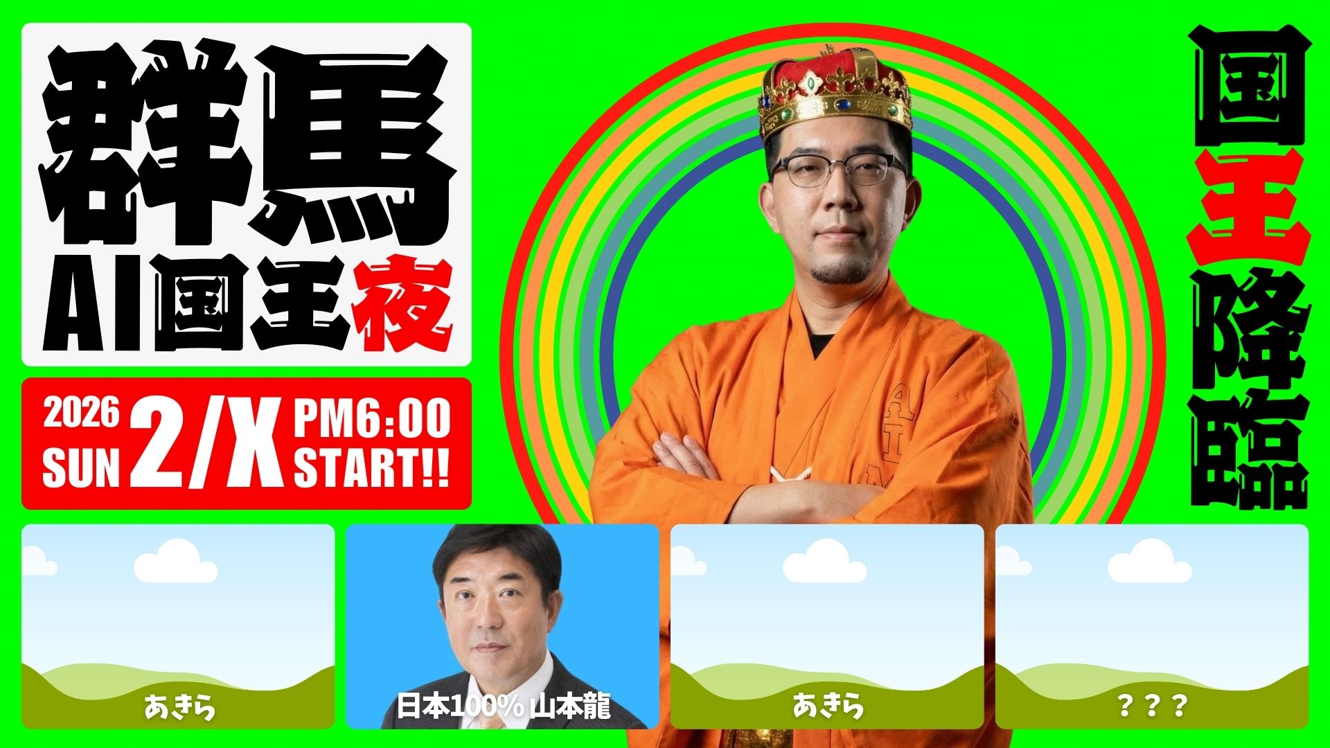 働くAI国王🎥 取材:しゃべる国王🛸 降臨:国王あらわる⚔️ 研修:おしえる国王🧞 相談:うなずく国王🎯 顧問:かいけつ国王🪩 作品:うまれる国宝 都道府県🗻 静岡AI国王伝説:厨二病爆走中🐴 群馬AI国王物語:2026ウマ男🌊 千葉AI国王物語:房総半島列伝🥇 GOLD:黄金の国復活🇯🇵 日本100%:キーパーソン名鑑🗾 DEEP JAPAN QUEST:秘宝🦅 Δ:現役首長限定コミュニティ エンタメ×進化⛩️ AI国王祭:わっしょい人間📺 AI国王TV:AIと人間をつなぐ🏆 AI国王杯:勝利の女神は・・🏫 AI国王トランプ:新ゲーム開発🏛️ AI国王党:AI王国第一党📽️ AI国王MOVIE:うごく世界 人間×女性🌕 MOON:女性限定コミュニティ🧱 凹凸:男女関係を深ぼる🧬 AI国民:人間をAIで作る実験 🌏 地球国物語:国境なき時代 author