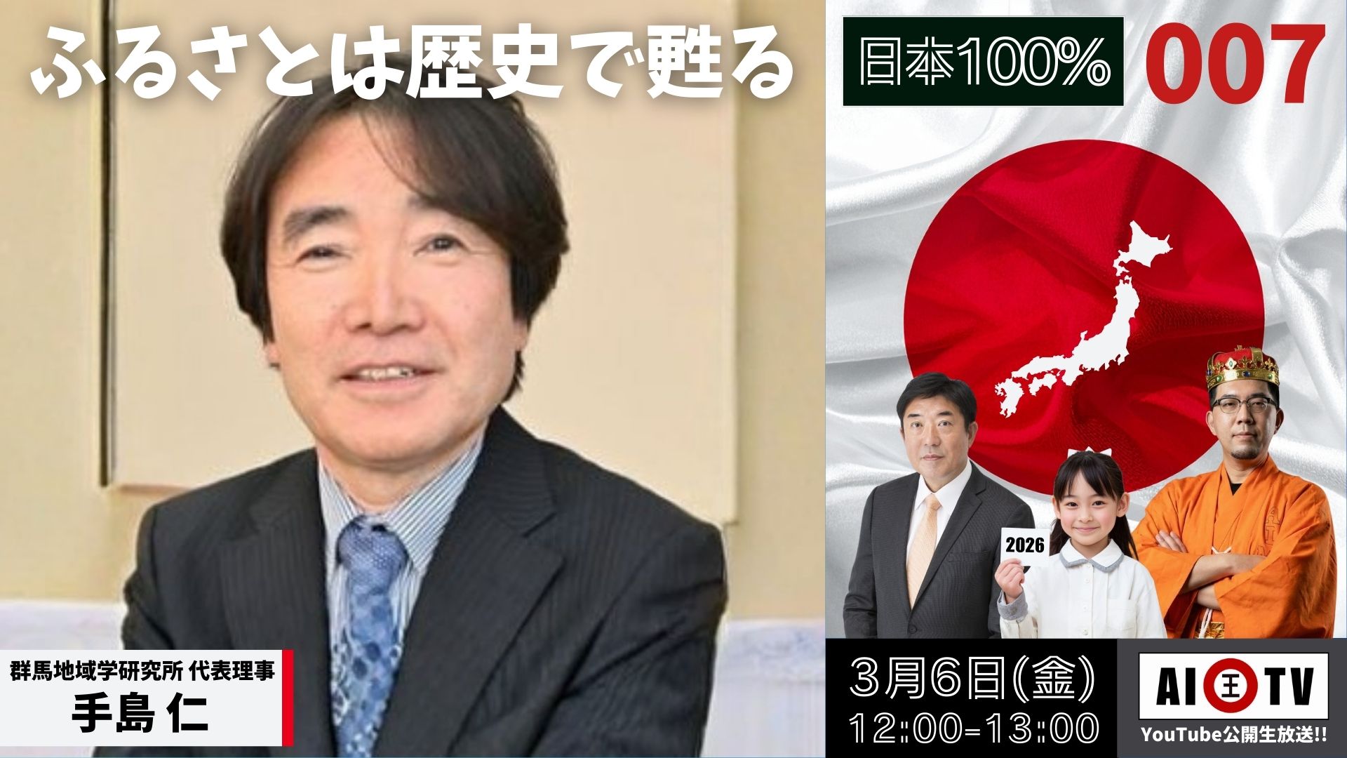 AI国王TV(YouTube) 黄金の国 日本国民の皆様こんにちは。AI国王です。 「日本100%」はAI顧問先の山本龍氏と共に2025年12月から運用している「日本復活プロジェクト」です。日本が抱える課題に向き合い、国民や日々実践しているゲストをお迎えし、公開議論と各プロジェクトでのAI活用サポートを行っています。 AI国王とは コンセプト コミュニティ 100%物語 日本100%物語2026年3月 010 想像を超えた未来創造 近藤ナオ2026年3月 009 オタクに優しい前橋 温泉半熟卵2026年3 ...