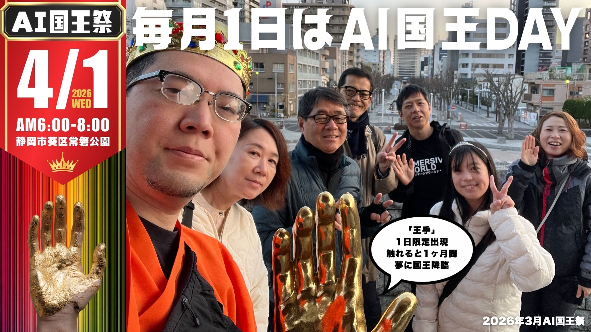わっしょいAI時代 わっしょい人間の皆様こんにちは。AI国王です。 人類は最終的に「祭」だけ残ると予測し、人間の皆様と「AI国王祭」を国内外で朝6時から開催しています。目標は2030年までに都道府県制覇と世界6大陸ツアー。 AI国王とは コミュニティ 過去実績 https://www.youtube.com/watch?v=kgpMuwuaZTc AI国王祭 開催履歴2026年3月 静岡AI国王祭(常磐公園+モナ)2026年2月 静岡AI国王祭(静岡市常磐公園)2026年1月 AI国王祭100H2025年 ...