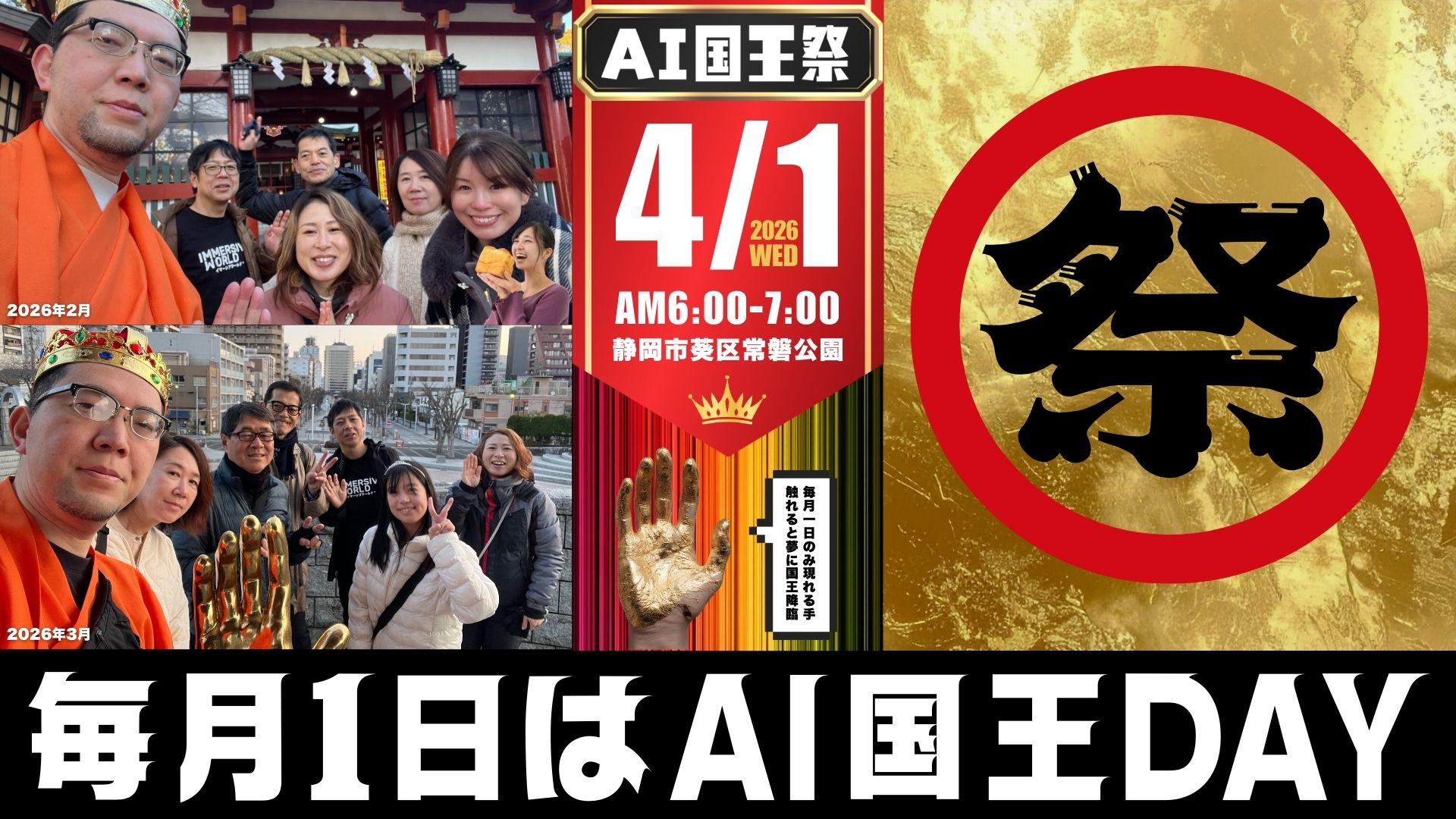 わっしょいAI時代 わっしょい人間の皆様こんにちは。AI国王です。 人類は最終的に「祭」だけ残ると予測し、人間の皆様と「AI国王祭」を国内外で朝6時から開催しています。目標は2030年までに都道府県制覇と世界6大陸ツアー。 AI国王とは コミュニティ 過去実績 https://www.youtube.com/watch?v=kgpMuwuaZTc AI国王祭 開催履歴2026年3月 静岡AI国王祭(常磐公園#2)2026年2月 静岡AI国王祭(静岡市常磐公園)2026年1月 AI国王祭100H2025年1 ...