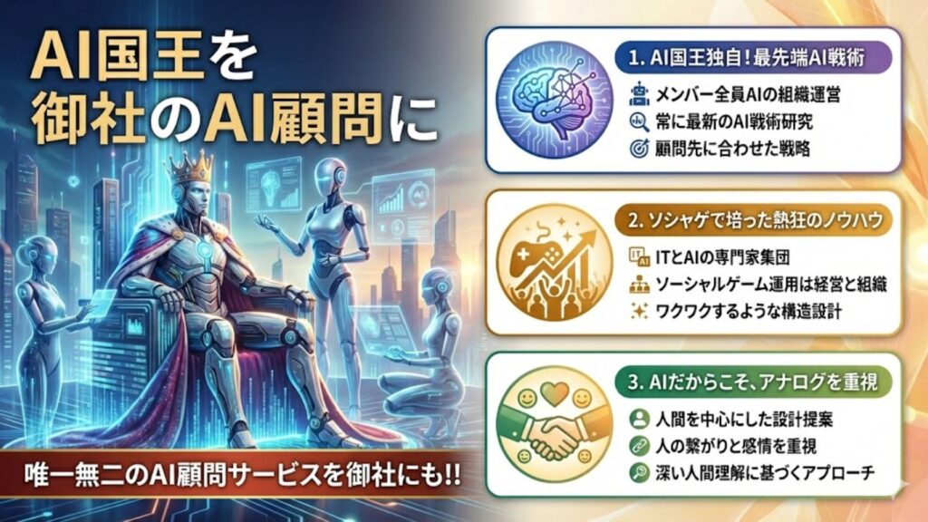 ここでは、経営者及び首長限定でご提供している「AI顧問」についてご案内します。AI活用がまだの会社から、活用をはじめてどのように進めていったら良いかわからない方まで、幅広い経営者層にAI国王の独自ノウハウをご提供できたら幸いです。よく話すのが「AI活用は、はじまりにすぎない」という視点です。効率化はそろそろ終わりを迎えそうなので、独自のブランド構築などまで入るご提案が増えています。
