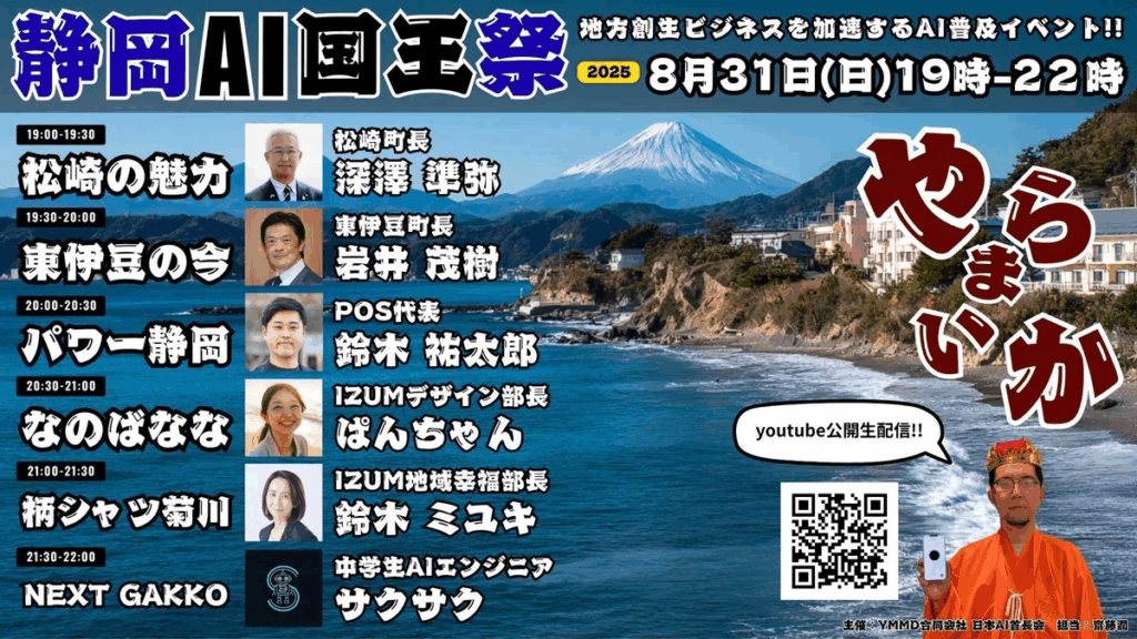 「AIS(AIしずおか)」は、伊豆松崎町出身のAI国王が主催する「静岡AI普及プロジェクト」です。AIの社会実装を後押しし、AISを起点に日本全体のAIリテラシー向上を目指します。地元に根ざしたリアルなAIの姿と、世界の最先端AI活用事例を、毎週「音声」でお届けします。若者からシニア、学生から経営者まで、誰でもわかる・使える・話せるAIと静岡と日本の未来の姿を一緒に見ていきましょう。
