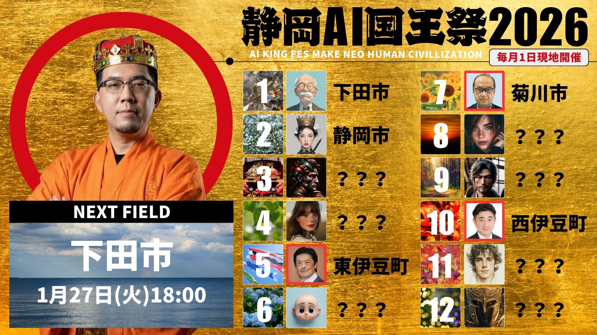 2026年の「静岡AI国王祭」はなんと毎月開催!!各自治体の首長にもご参加頂き静岡をAI先進県化を進めてゆきます。新キャラしずおかんが着ぐるみになる日はくるのか!?