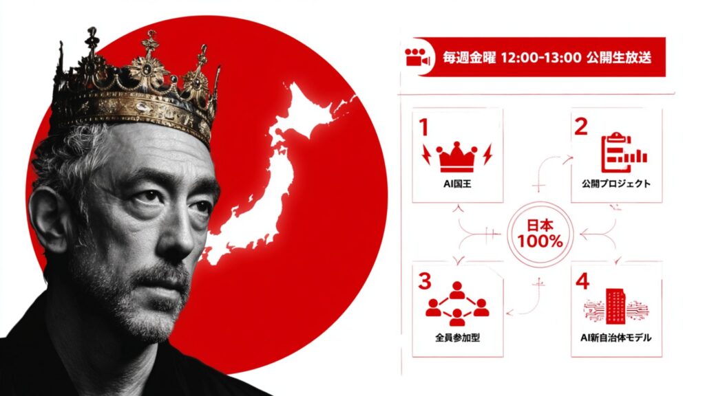 「日本100%」は山本龍氏と共に2025年12月から運用している「日本復活プロジェクト」です。日本が抱える課題に向き合い、国民や日々実践しているゲストをお迎えし、公開議論と各プロジェクトでのAI活用サポートを行っています。