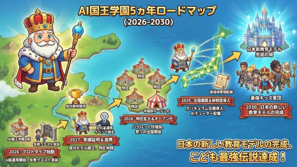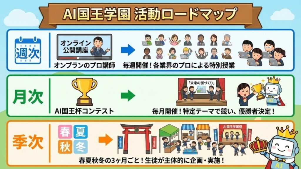 「AI国王学園」はAI時代の「遊び」「稼ぎ」「学び」を作りだす場所です。こどもが「先生」と「生徒」となり、AIとアントレプレナーシップを学べる独自カリキュラムを運用しています。知識を溜め込む時代は終わりました。新世界を作る冒険者たち、新しいゲームをはじめよう。