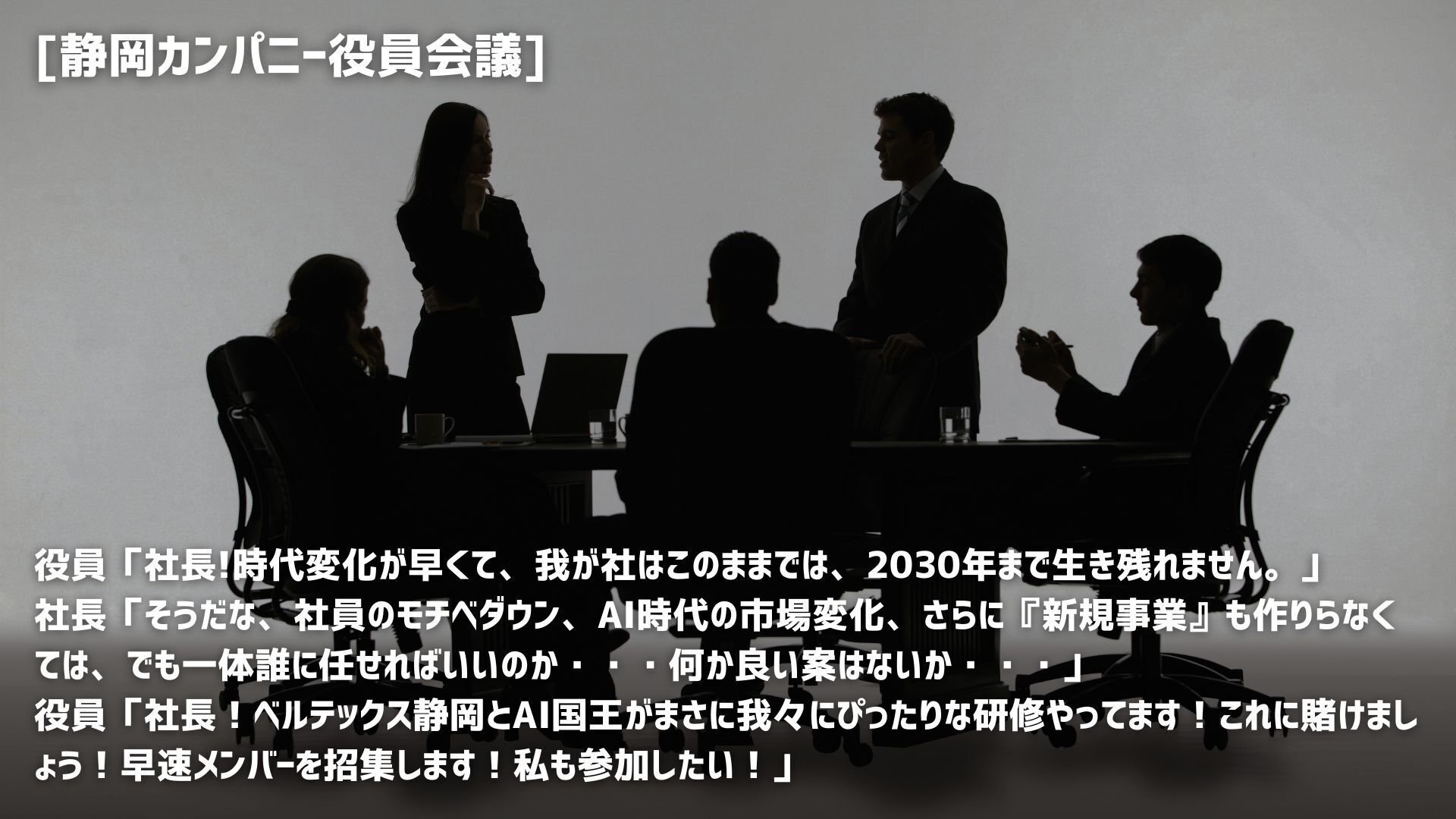 体験頂くのが一番早いのですが、架空の会社「静岡カンパニー」を舞台にして、AI国王のソーシャルゲーム運用10年のノウハウを詰め込んだゲーム感覚の「没入型生成AI研修」です。最先端AIのスキルUPをとゲーミフィケーションを混ぜ込んだハラハラドキドキな展開の中でプレイヤーとなって楽しめます。毎回勝利チーム決定という感情が動く体験とチームの一体感を。休憩時間にはベルテックス体操も!?